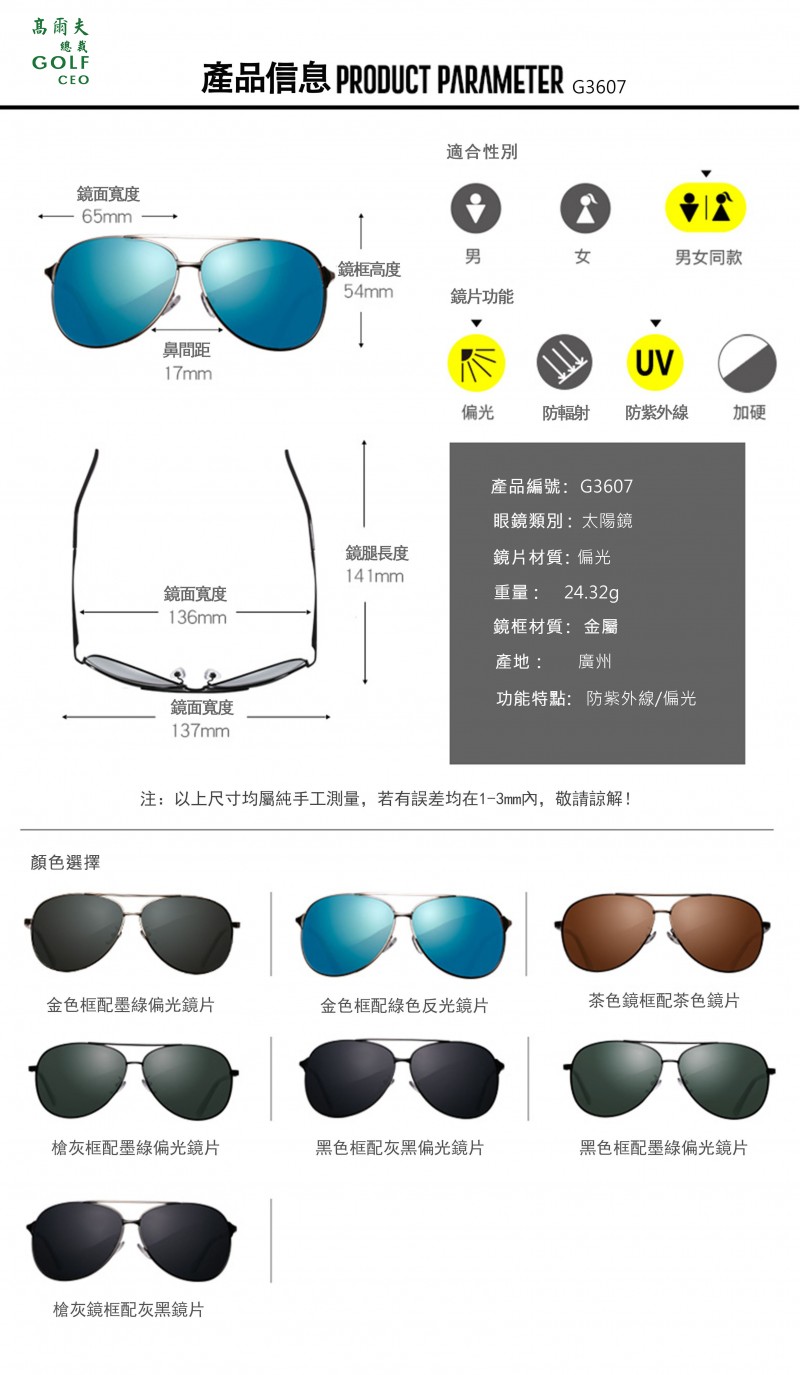 GOLF CEO高尔夫总裁 G3607偏光太阳眼镜男女同款