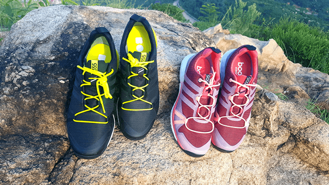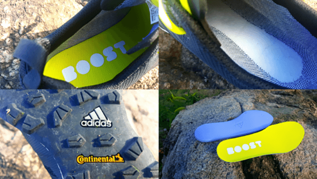 这款越野跑鞋为中强度鞋面,前部带有包头和护趾做运动中的保护,鞋体较为轻便,复合多层鞋底,使用Boost材料在脚跟及脚掌部做为中底材料;入脚感觉柔软,弹性十足;越野跑鞋的大底为德国“马牌”橡胶定制大底;鞋底做了功能性应用型的颗粒设计,前脚掌部和足跟部根据需要做了不同深度和齿纹走向的颗粒,满足并贴合越野跑的运动需要;
